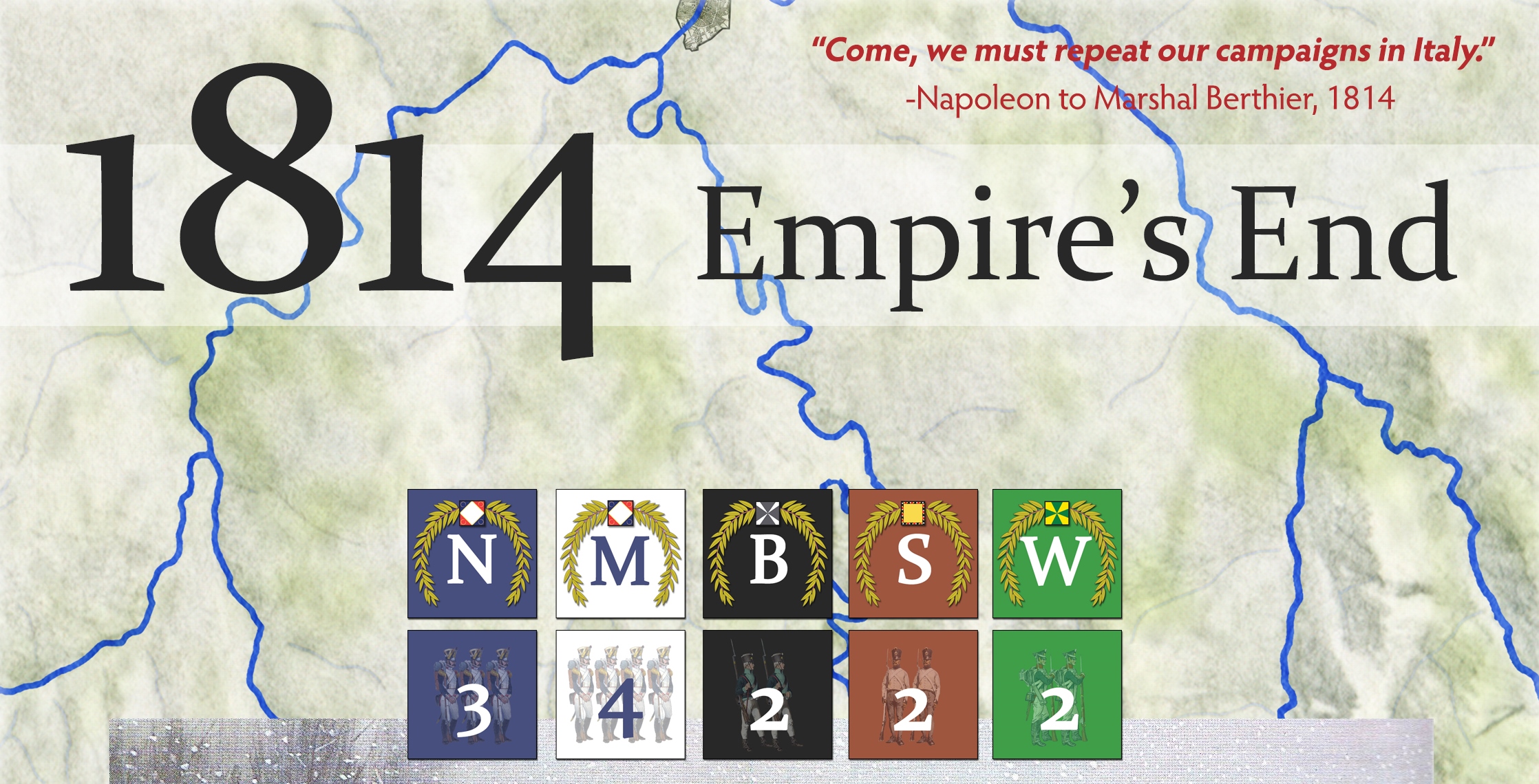 1814: Empire's End - This game takes in the full scope of both sides’ military possibilities inherent in the 1814 situation. Napoleon has been sent reeling from his second massive defeat in 2 years at Leipzig and must defend France from a now overwhelming coalition. Badly outnumbered, Napoleon's main chances lay in repeating his nimble maneuvers in Italy some 20 years past. The ensuing campaign was one of Napoleon's finest but he could not match the resources of the Allied Coalition.